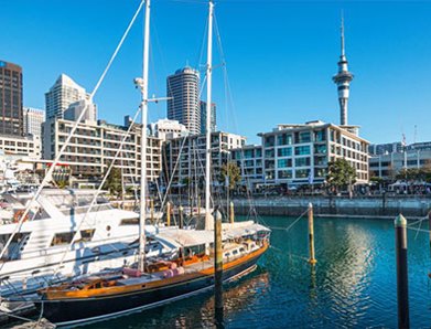 The bustling and vibrant city center of Auckland, New Zealand. It is the primary commercial, cultural, and entertainment hub of the city and is located on the narrow strip of land between the Waitematā Harbour and the volcanic hills of Auckland.